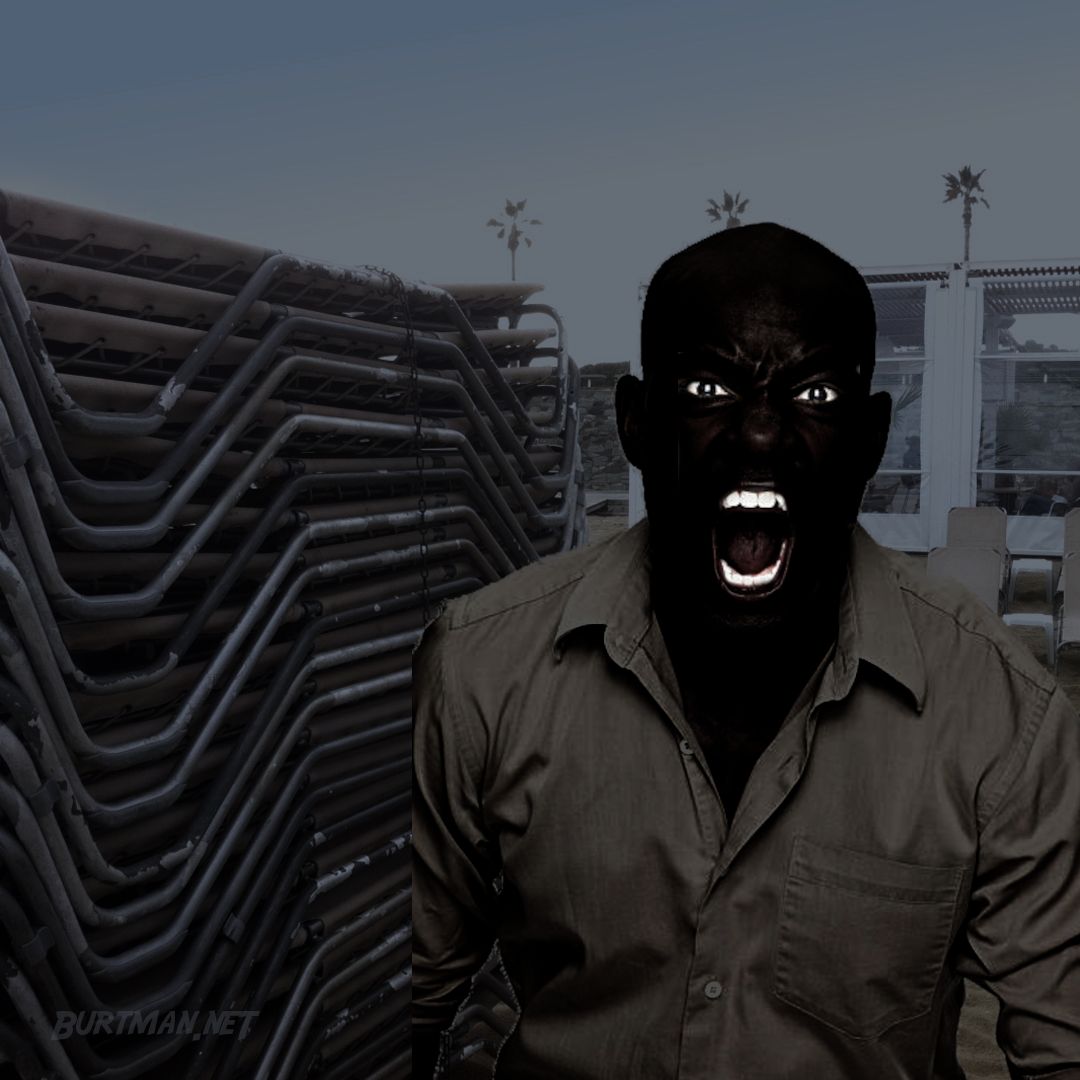 Between the ocean and this ridiculous restaurant, lies an area of the beach that's usually covered in deck chairs. Now, of course, they were stacked up in rows because nobody wants to sit out on the beach in the freezing wind, and with only one import to look after the whole setup, the chairs needed to be tucked in close. And it's for this reason that we didn't spot our boy, Mohatou Mzakakuwu Chaba'ai L'. Keith, to you and me.