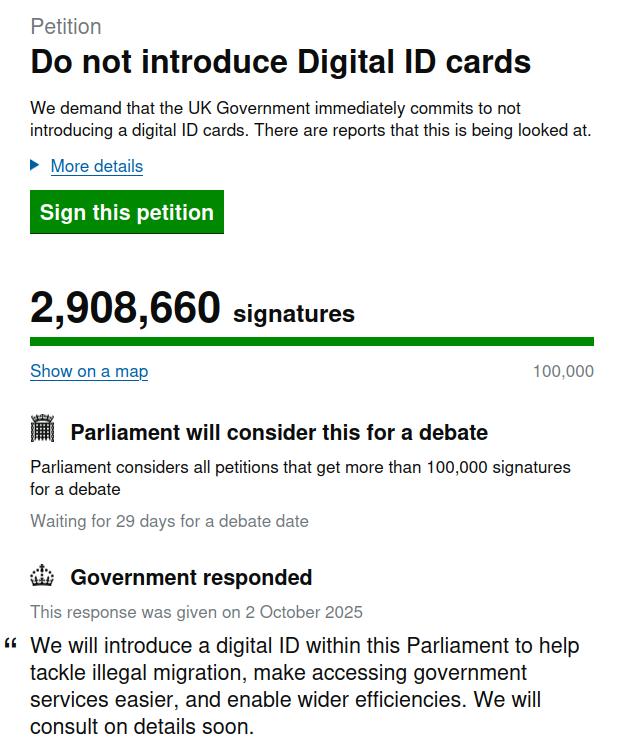 Britain's been hijacked by a pedophile gang protector who has recently stonewalled a legitimate government petition with almost 3,000,000 signatures, plainly calling for the scrapping of his digital ID system, and is now saying that the WEF digital ID system will be installed by the current administration, despite the fact that he's the only one that wants it. Heck, even his own party is divided on the matter, and all the other ones are dead against it.