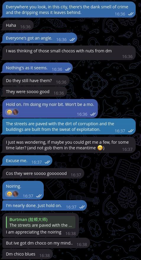 It started out well, but there was a problem. Burtmanwoman had the munchies and she couldn't keep her mush sealed, while I crafted the mood. Here's the proof: