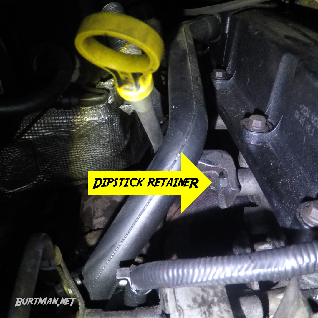 8. If necessary, remove the retaining bolt that holds the dipstick pipe in position. This was preventing removal of the manifold on my van.