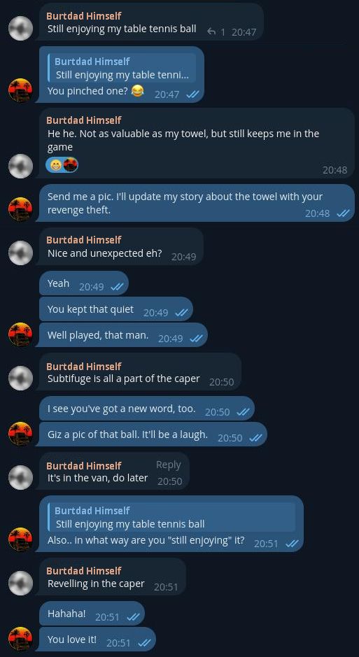 But only a few weeks later, whilst out on another jolly, BD turned up at the Burt-Cave, where he set about searching for the towel, as though it actually mattered. And, to his surprise (mainly at what he called "the utter nerve of it"), he immediately found it on the bathroom radiator, where I was (and I quote) "rubbing it in his face". I wasn't, obviously, because I'd moved on. But that's BD for you.